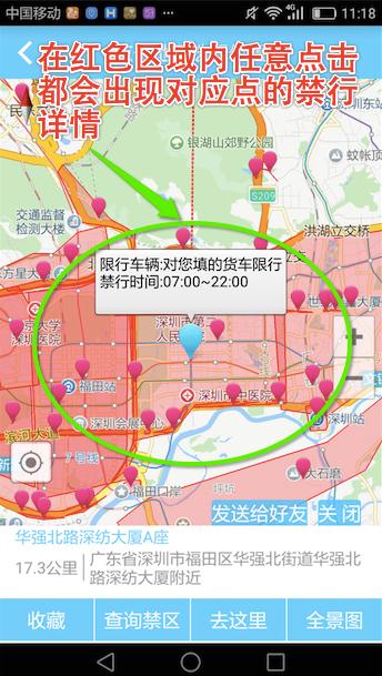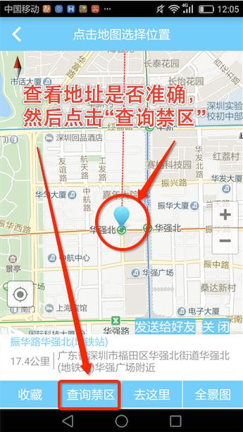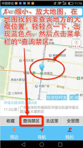 一、地图选点查询禁区。我们就以深圳市华强北为我们的查询禁区的目的地。