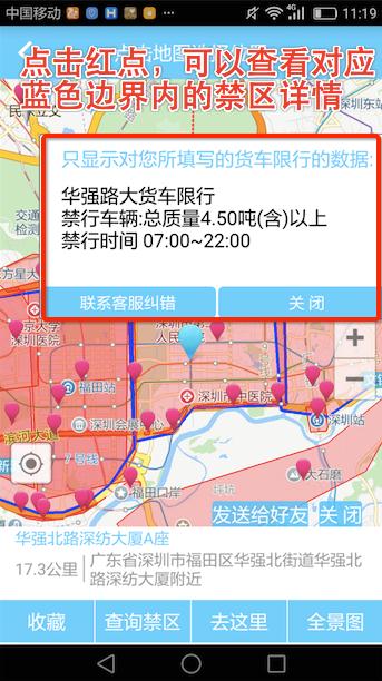 2、用户在红色区域内随意点击,都会出现蓝色点,并显示出对应地点的对应用户所填车辆的详细禁行时间;点击红色点,可以查看蓝色边界内对应的禁区详情。